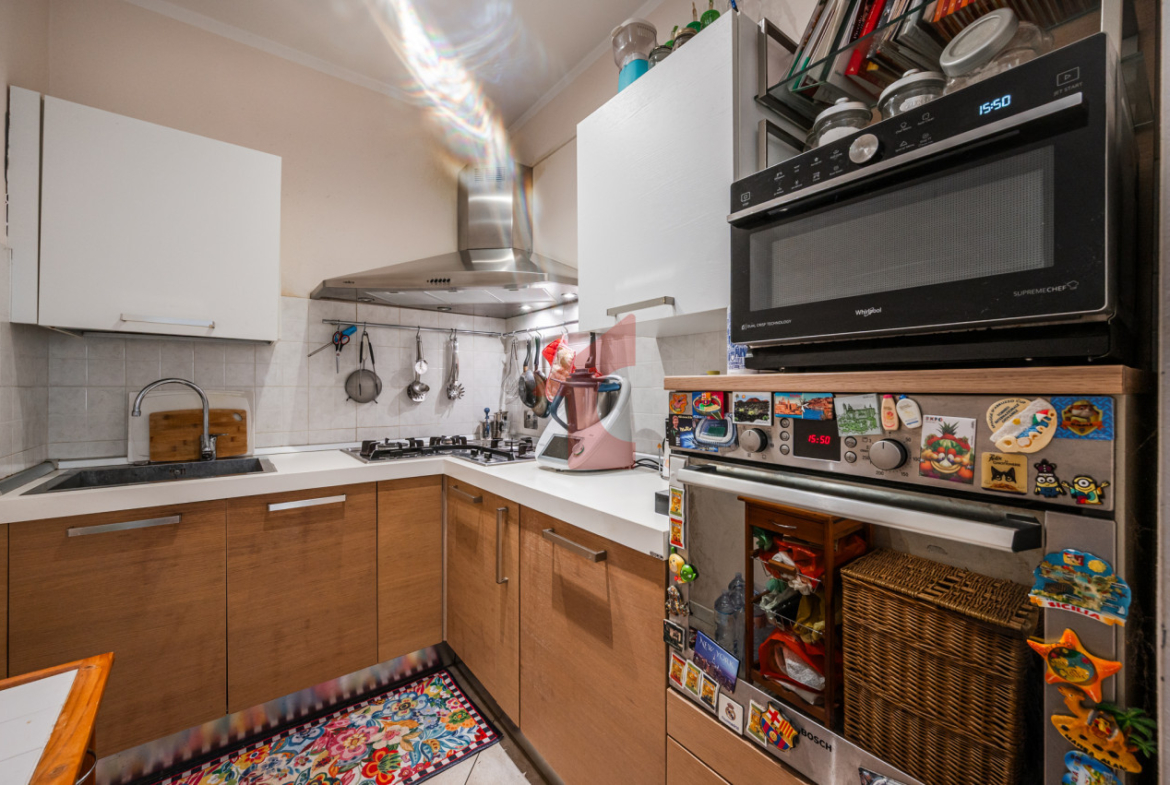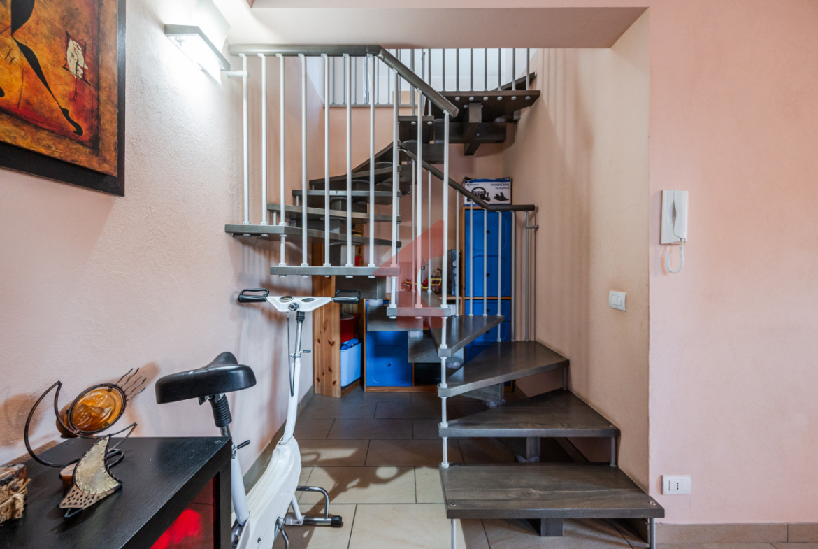 Al piano superiore si trova la zona abitativa principale: luminoso soggiorno con angolo cottura e balcone, due camere da letto e bagno finestrato. Ambienti ben distribuiti e accoglienti, ideali per famiglie o coppie che cercano comfort e funzionalità.
